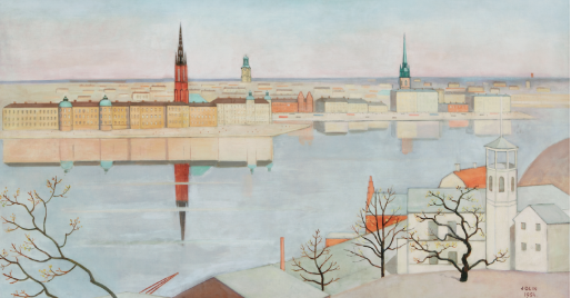Vår huvudstad inspirerade många av hans mest kända verk. Han skildrade hamnar, gator och parker med ett förenklat och dekorativt måleri som fångar stadens atmosfär och rytm. Målningar som Strandvägen i sol och Djurgårdsbrunnskanalen visar hans kärlek till huvudstaden och dess ljus.